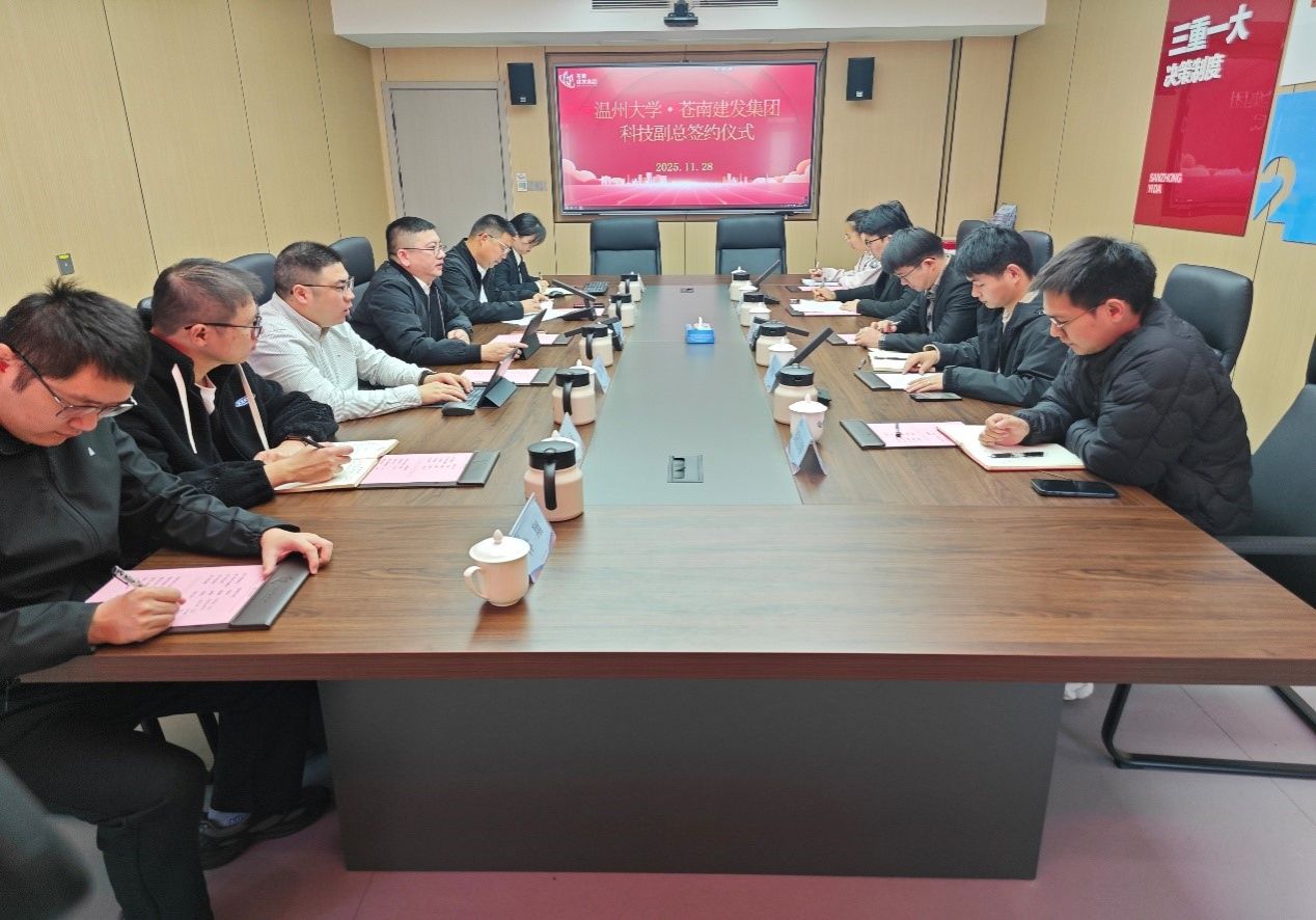 与苍南县建设发展集团有限公司举行科技副总签约仪式。学院副院长符洪涛、学术副院长倪俊峰、高紫阳老师,与苍南建发集团党委书记、董事长项延良,党委副书记、纪委书记张文校,人力资源部部长叶赛、办公室主任章剑等共同出席。
