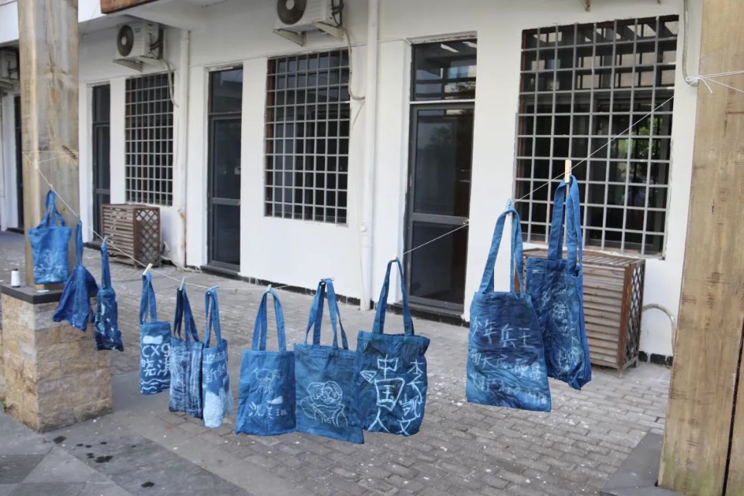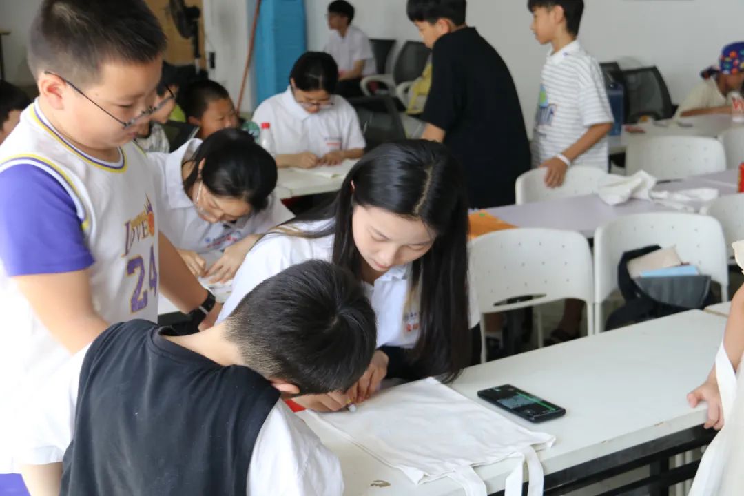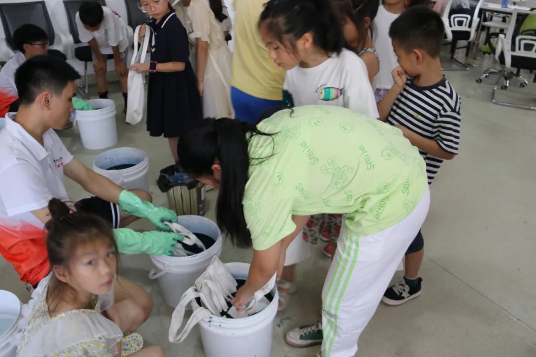 活动中,大学生志愿者们再次开展关于“蓝夹缬”技艺的系统学习。一边由大学生志愿者调制染料做好前期的准备工作,另一边由大学生志愿者指导未成年人在帆布袋上完成图案绘制。活动现场,只见孩子们用铅笔在帆布袋上完成了初步的构想,接着又用蜡笔开始绘制,相比之前大家的想法更加的天马行空,更加具有创造力,制作与绘画的工艺也增进了很多。随后,大家被分成四组,在志愿者老师的帮助下有序地进行染色、清洗、晾晒。最后,孩子们和自己的蓝夹缬作品进行合影留念。