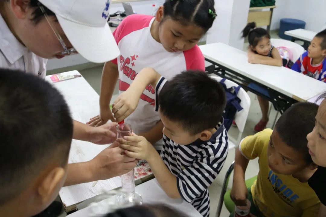 实验过程中,大学生志愿者将孩子们分成六个小组,小组化管理指导他们进行安全实验。为使得实验效果更加明显,志愿者还挑选了不同颜色的色素加入试剂。实验终于开始了,孩子们兴奋又好奇地围在老师身边,观看到大量的泡沫喷薄出多彩的画面,这神奇有趣的现象引得孩子们发出一阵阵惊呼。每次泡沫“嗖”地像喷泉一样从容器中喷涌而出,似巨大的“牙膏”,也酷似大象的鼻子,把孩子们惊讶成一个个表情包。实验结束后,志愿者们带领孩子们清理实验后杂乱的桌面。而此时,孩子们仍然很兴奋,仍然沉浸在做实验的乐趣中。