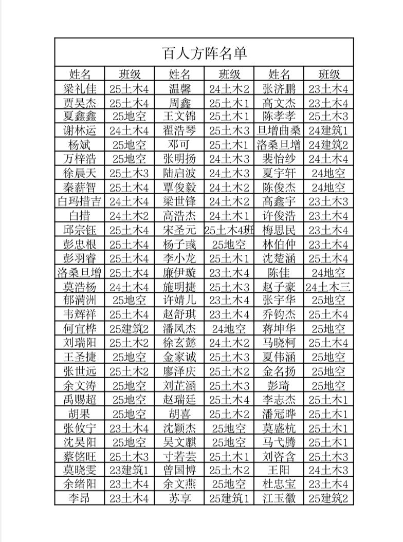在我校第四十八届运动会期间,我院学生积极参与百人方阵团队,刻苦训练。经学院研究决定,在此对参与百人方阵的同学给予通报表扬。百人方阵通报表扬名单如下