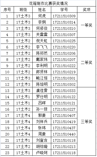 花箱制作比赛落下帷幕,获奖结果已产生。现将获奖名单予以公示。公示期为5个工作日(2021年4月23日至2020年4月29日),如在公示期间有异议,请与学工办相关负责人联系,联系电话:15268797366。