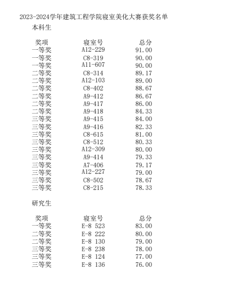 本次活动主要围绕着寝室卫生和寝室美化展开,要求展现宿舍文化风采及同学们和谐的相处氛围。经过评委细致评分,获奖结果如下: