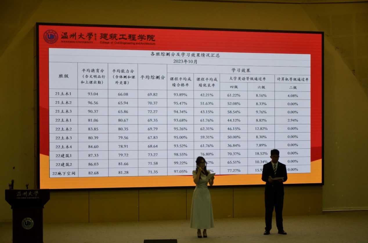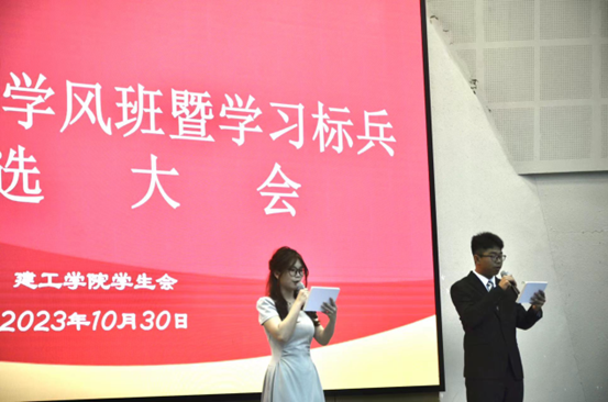 本次大会围绕优良学风班&学习标兵评比展开。主持人介绍本次会议的出席嘉宾并公布各班基础分及说明注意事项后,各班代表上台展示一年来的班级学风建设情况。在基础学业方面,各班介绍了各类学业指标的完成情况;在班风建设方面,评选班级开展了丰富的主题团日活动,提高了班级凝聚力;在课外活动方面,各班积极开展主题实践,通过丰富多元的活动形式展现积极进取的精神风貌。经过评选,21土木2班、22建筑1班 、21土木3班、22地下工程等4个班级获得2023~2024年“优良学风班”的称号。