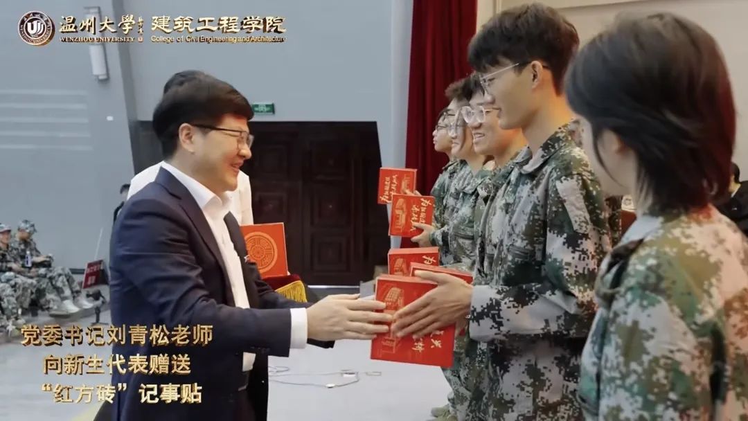 刘青松书记向新生代表赠送“红方砖”记事贴,寓意建工学子在未来大学生活里充实、无悔地码好专业人生的每一块“砖”,成就专业人生的高楼大厦,为民族复兴铺路架桥,为祖国建设添砖加瓦。