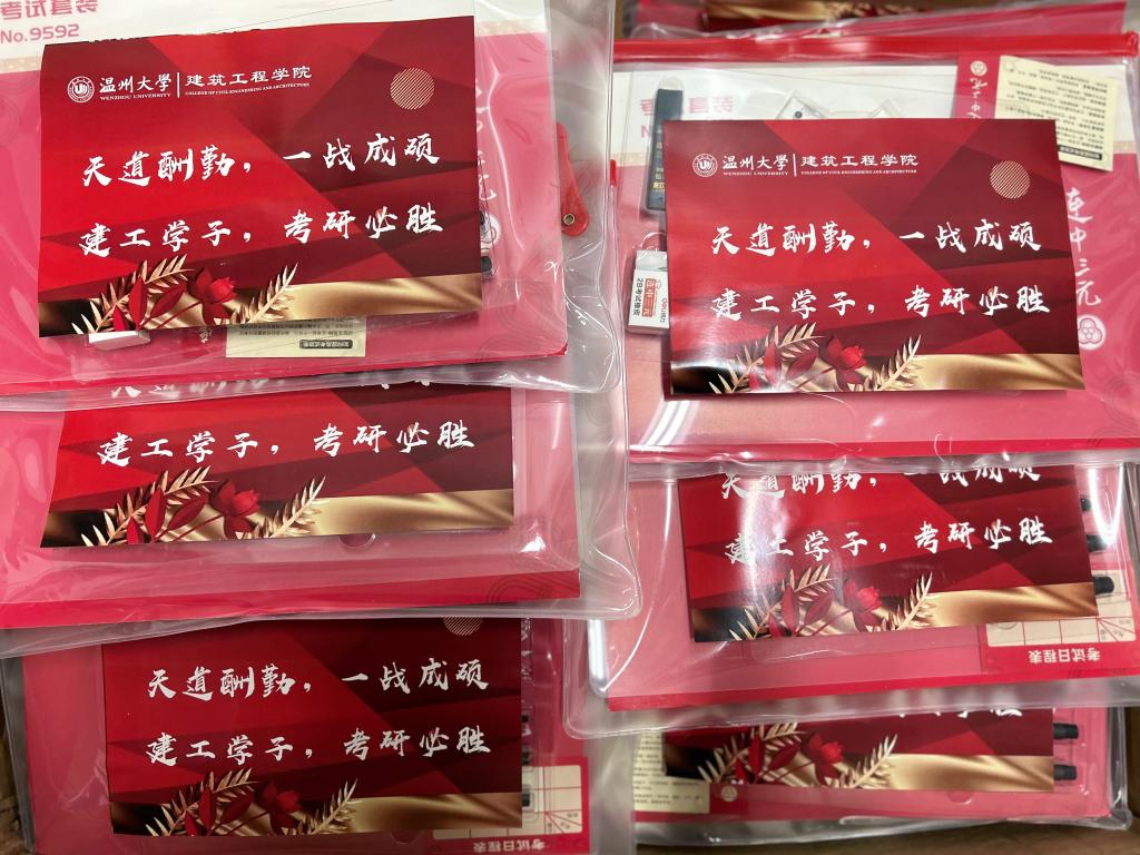 2023年研究生考试将在12月24日开考,我院高度关注考研学生状态。为鼓励我院考研学子都能在最后的备考日子里调整心态、树立信心,学院为他们准备了特别的心意——考研文具套装,并送上了暖心的祝福,让冬日的备考更加温暖。除此之外,为防范新冠疫情,保障考研学生的健康状况,学院为每位考生准备了N95口罩以备不时之需。