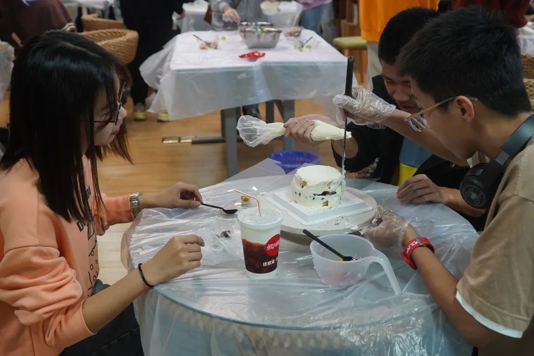 活动开始前,权益心理部干事参与场地的布置,将场地给分为10个小区域,随后将各式蛋糕食材和材料工具摆放在桌面。活动中,各位同学们和小干事一起撸起袖子,积极参与制作蛋糕的过程。郭瑞芬老师与黄骐骥老师也与各位同学们参与到了蛋糕制作的过程中去。从蛋糕外形设计到蛋糕制作,各小组成员共同协商、团结协作,共享劳动成果。同学们在体验劳动的同时也互相分享了彼此在做蛋糕时的喜悦。