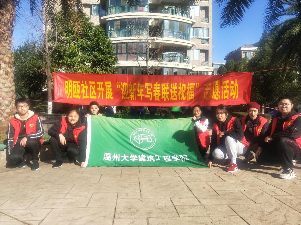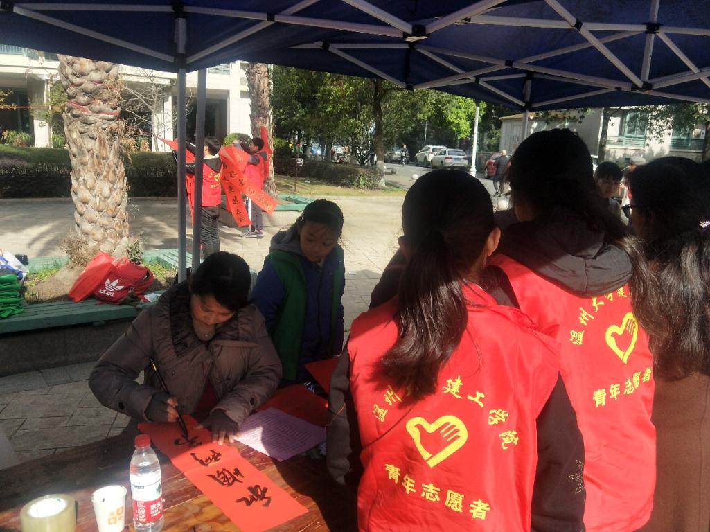 青年志愿服务部于2020年1月12日上午组织志愿者前往明瓯社区开展暖冬行动,以写春联送春联的形式为他们送去春节的祝福。