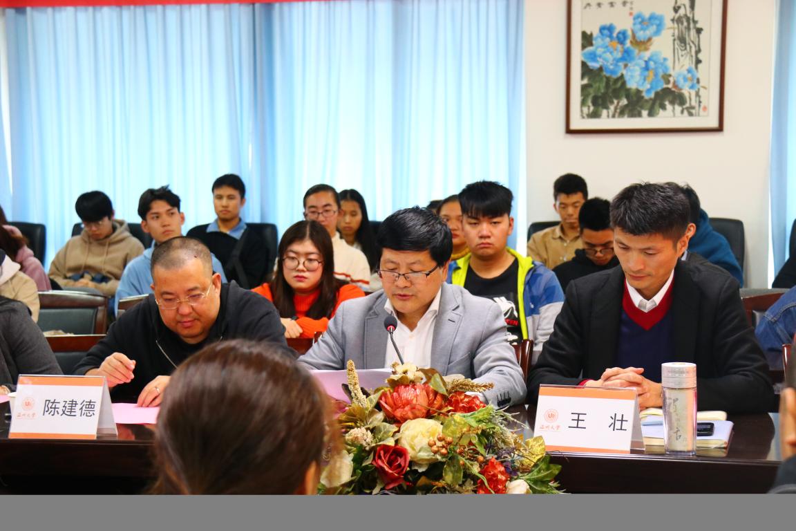 最后,我院党委书记刘青松老师代表学院向校友陈建德先生赠送纪念品,并合影留念。