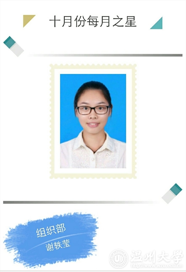 是组织部的新干事。在进入组织部的一个月里,她认真仔细,圆满完成了学生会交给她的每项任务,获得了部长及其他干事的好评。在为团学建设添砖加瓦的同时,她也锻炼了自己的能力,充实了自己的大学生活,从一个懵懂不自信的大一新生,变成了一个遇到事情沉着镇静的合格干事。她感谢组织部给她以机会得到历练,组织部也感谢她对待工作的一丝不苟。