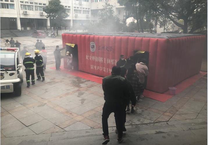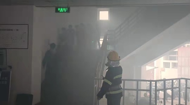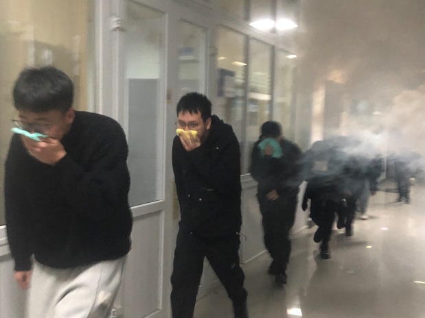 14:00演练准时开始。7号楼B209实验室冒出浓烟,实验室老师发现火情,立即带领学生用湿毛巾捂住口鼻,弯着腰,迅速有序地从B幢西侧楼梯跑出,并把发生火灾及疏散的情况报告给郭林副院长,郭林副院长再报告学院应急工作领导小组总指挥刘青松书记。同时,7号楼1、3、4、5层的学生也在老师的带领下从西侧楼梯撤出,通过模拟逃生体验屋,到达避险区域。