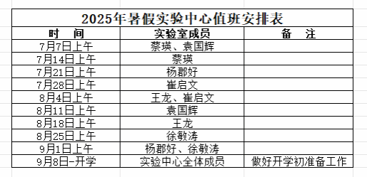 为方便师生假期办事、用印,保持工作联系,实验中心安排本部门工作人员暑假值班。现将值班安排表予以公布: